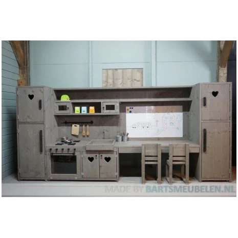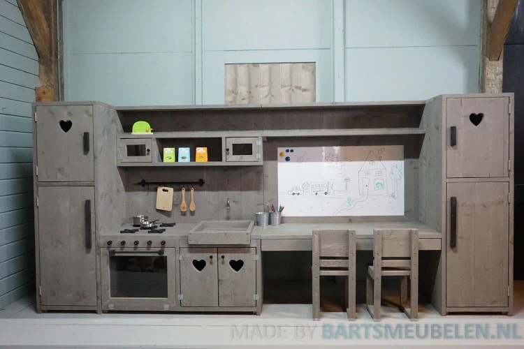Doordat wij alles op bestelling maken zijn onze speelmeubels voor kinderen grotendeels te personaliseren. Zo kiest u zelf het soort steigerhout, de kleur (bijv. wit, grijs of zelfs roze). En ook voor het ovendeurtje is er een keuze tussen plexiglas of krijtbord. Daarnaast bepaalt u zelf de werkbladhoogte die past bij de leeftijd van uw kleintje(s) en kunt u een figuur kiezen.