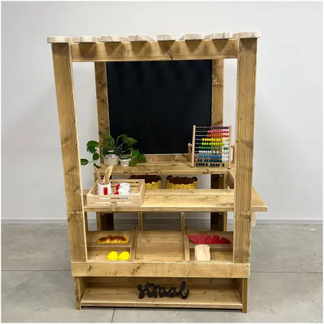 Aan één zijkant zit een klein plankje dat fungeert als afsluiting van de kraam. Dit onderdeel wordt los geleverd, zodat je zelf kunt bepalen aan welke kant je hem wilt plaatsen. Voorin vind je de toonbank met daaronder een royale opslagruimte. De losse steigerhouten latjes werken als tussenschotjes, zodat kinderen zelf kunnen indelen hoe ze hun “winkel” organiseren.