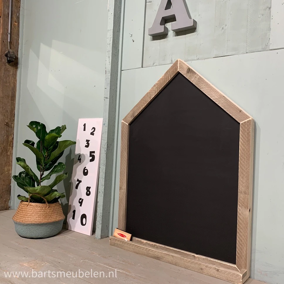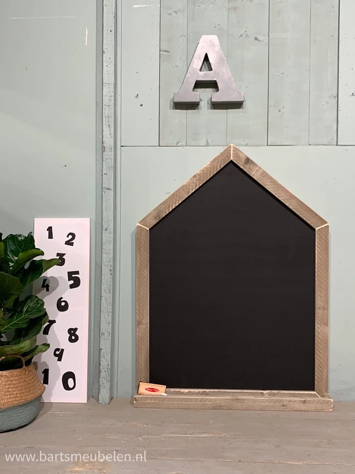 Dit krijtbord met houten rand in de vorm van een huis is verkrijgbaar in 4 afmetingen: