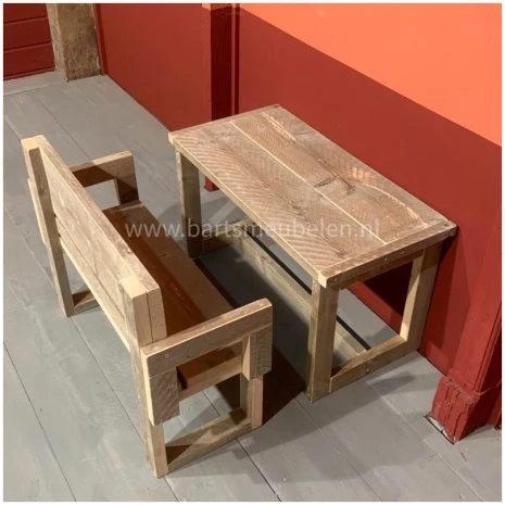 Deze steigerhouten peuterset Kian is perfect voor uw ondernemende peuter. Op het bankje is voldoende ruimte voor 2 kindjes om heerlijk te tekenen en kleuren. Hieronder stel je deze set naar je eigen wensen samen.