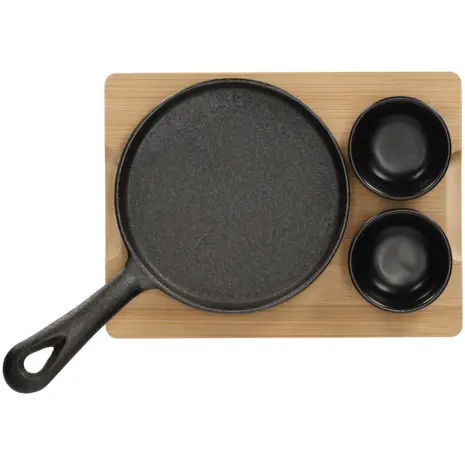 • Complete set: gietijzeren pan, twee schaaltjes en bamboe plank