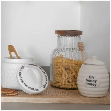 Deze grote voorraadpot van Jens Living met acacia houten deksel is perfect voor het bewaren van etenswaren zoals koekjes, ongekookte pasta of havermout. De pot heeft een ribbel reliรซf wat een luxe uitstraling geeft. De houten deksel heeft een rubberen ring voor een luchtdichte afsluiting. Hierdoor blijven de etenswaren langer vers.