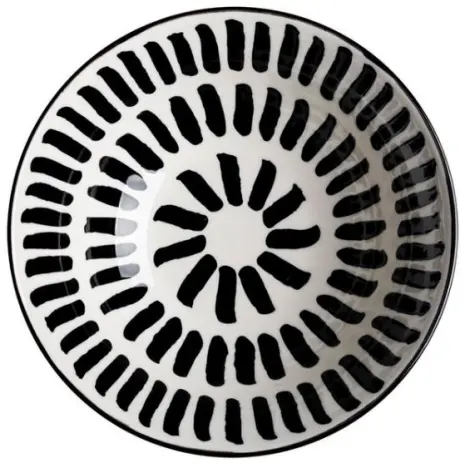 In deze prachtige schaal serveer je gerechten en hapjes in stijl! De schaal is onderdeel van het nieuwe Petiscos servies van Gusta, een prachtige zwart/wit serie met elegante patronen. Deze schaal gebruik je voor je favoriete pasta dish, een frisse salade in te serveren of als luxe broodschaal. De buitenkant is zwart van kleur en aan de binnenkant vind je een tof streepjespatroon. Combineer hem met de andere Petiscos borden en schalen en dek zo je hele tafel in stijl!