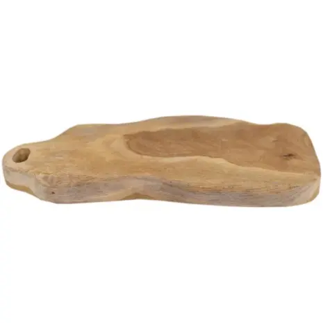 Teakhouten serveerplank van 40 cm, handgemaakt en onbehandeld. Warm van kleur en ideaal voor het serveren van hapjes.