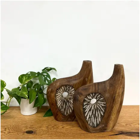 Het gebruik van Suarhout maakt deze vaas niet alleen stijlvol, maar ook duurzaam. De houtsoort is stevig en gaat jarenlang mee, waardoor de vaas een blijvende toevoeging is aan je interieur. Door het vakmanschap van Indonesische ambachtslieden is elke vaas zorgvuldig met de hand afgewerkt. Kleine scheurtjes kunnen na verloop van tijd ontstaan, maar dit benadrukt juist de natuurlijke en authentieke uitstraling.