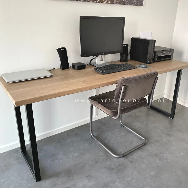 Op zoek naar een fijn bureau voor je kantoor of in de tienerkamer? Dit prachtige bureau heeft een massief eikenhouten blad van maar liefst 40 a 45mm dik. Het blad rust op 2 stalen U-onderstellen van koker 40x40mm. Zo blijft er voldoende ruimte over onder het blad.