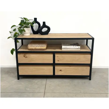 Dit kastje laag met lades past in een industriele woonstijl. Het basis bestaat uit een stalen frame wat is ingelegd met rustiek eikenhout.