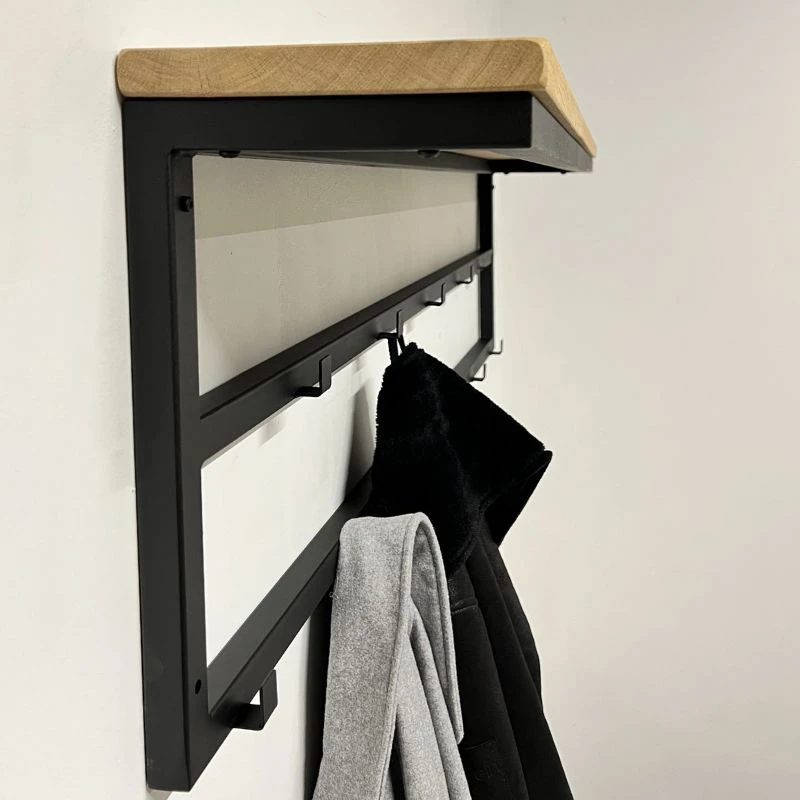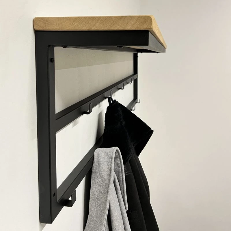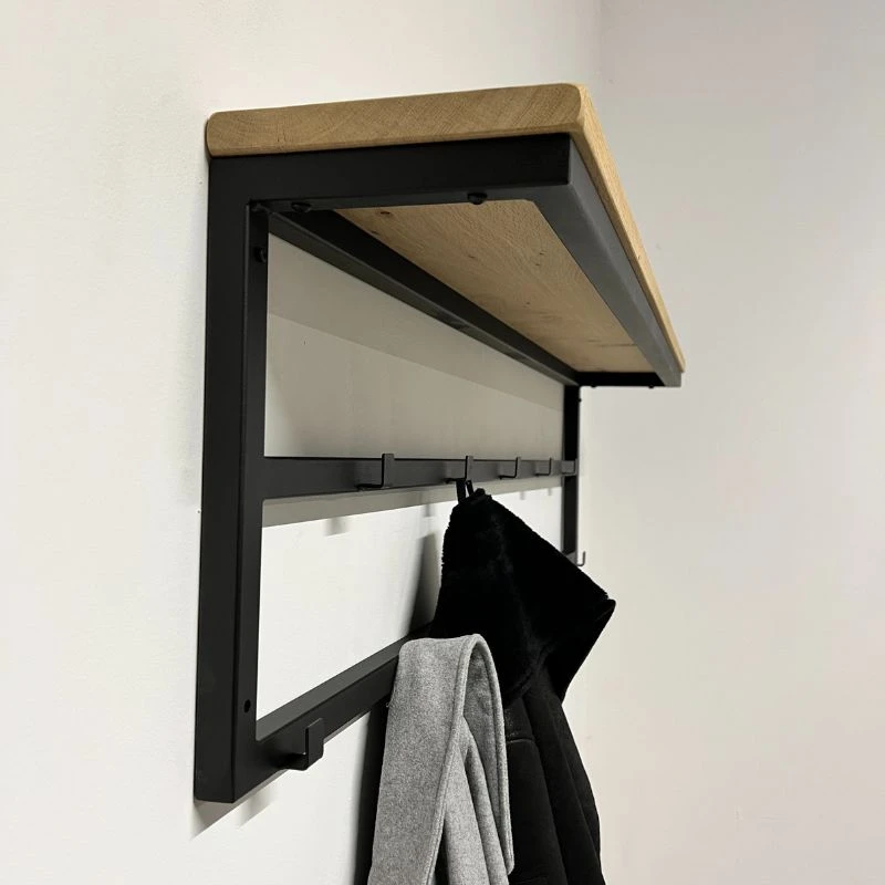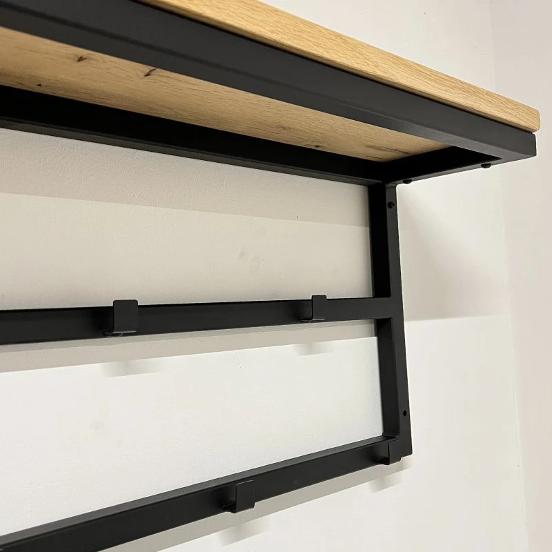 Deze industriele kapstok is prachtig voor aan de muur. Door de 11 kapstokhaken biedt hij veel opbergruimte voor jassen. Bovendien heb je door de eikenhouten plank bovenop nog ruimte voor kleine mandjes, hoeden of andere accessoires.