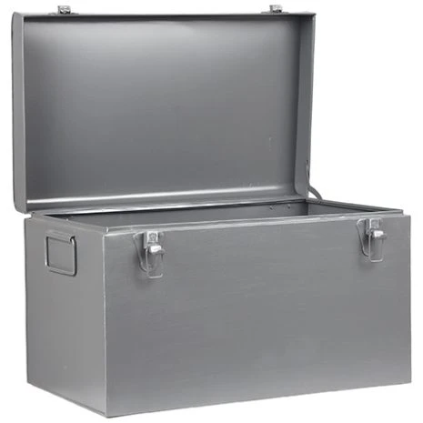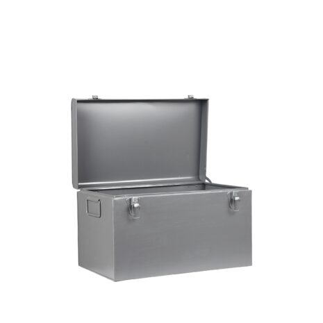 Deze stoere rechthoekige opbergkist, gemaakt van hoogwaardig metaal is uitgevoerd in de kleur antiek grijs en heeft een vaste deksel die gesloten kan worden door middel van de 2 leuke industriรซle sloten aan de voorkant van de kist. Tevens is deze kist in het bezit van handvaten aan de zijkant wat de mogelijkheid biedt de kist makkelijk te verplaatsen.