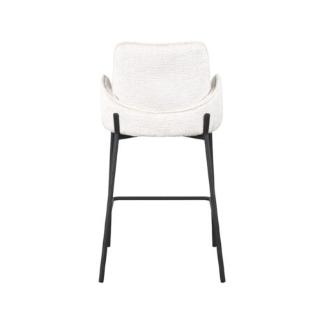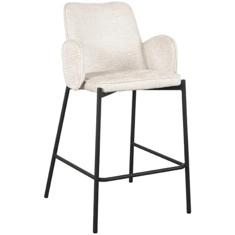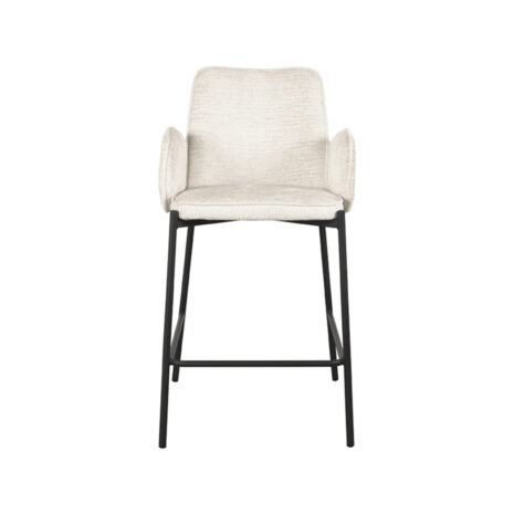 Barkruk Joni, uitgevoerd in cream elegance heeft een luxe ronde zitting, rugleuning en is in het bezit van armleuningen. Deze combinatie maakt Joni een luxe barkruk met ontzettend veel comfort. De armleuningen lopen achter de rugleuning langs waardoor de barkruk een uniek uiterlijk krijgt en er ook nog eens ontzettend leuk uitziet aan de achterkant. Dat is natuurlijk een fijne bijkomstigheid als de barkrukken aangeschoven staan aan tafel of een bar. Het ranke maar doorlopende zwarte frame waar de zitting als ware op rust geeft de barkruk een luchtige uitstraling. Het U-frame zorgt voor een makkelijke op- en afstap en dient als voetensteun. De uiteinde van het frame loopt op vier zijdes een klein stukje door wat zorgt voor een speels effect.