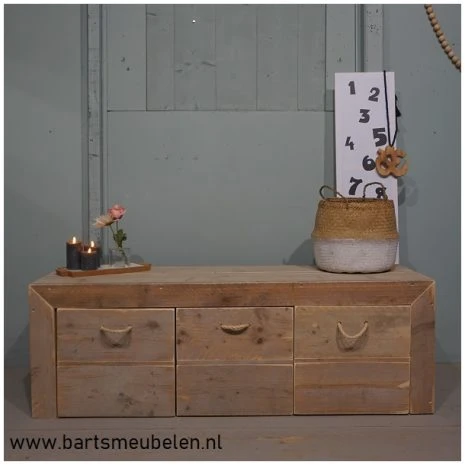 Steigerhouten opbergbank 1 is een sfeervolle bank met opbergbakken op vilt of wieltjes voor in jouw woning. Hieronder stel je deze bank met opbergruimte naar jouw eigen afmetingen en wensen samen.
