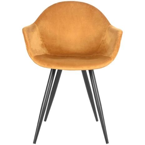 Eetkamerstoel Forli, uitgevoerd in oker kleurig fluweel heeft een zeer luxe en comfortabele kuip voorzien van elegante rondingen en armleuningen. De prachtige duurzame basis als kuip gestoffeerd met het mooiste fluweel zorgt voor een comfortabele, stevige zit. Forli is in het bezit van licht uitlopende poten, uitgevoerd in zwart metaal, waardoor de stoel stevig op de grond staat en ook nog eens een leuke speelse touch krijgt.