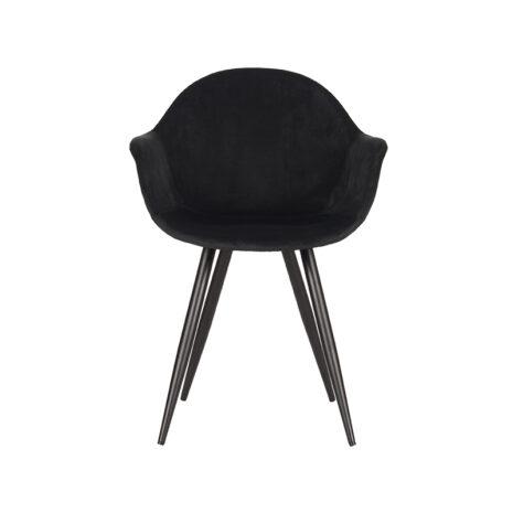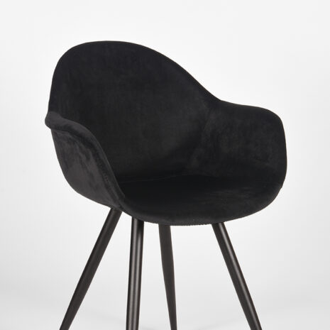 Eetkamerstoel Forli, uitgevoerd in zwart kleurig fluweel heeft een zeer luxe en comfortabele kuip voorzien van elegante rondingen en armleuningen. De prachtige duurzame basis als kuip gestoffeerd met het mooiste fluweel zorgt voor een comfortabele, stevige zit. Forli is in het bezit van licht uitlopende poten, uitgevoerd in zwart metaal, waardoor de stoel stevig op de grond staat en ook nog eens een leuke speelse touch krijgt.