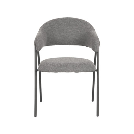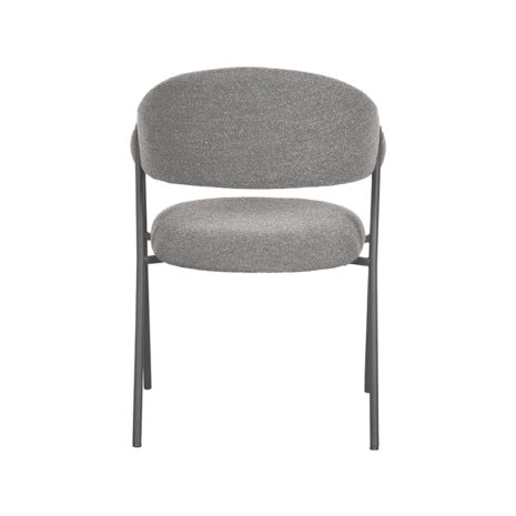 Eetkamerstoel Lowen, uitgevoerd in grijs bouclรฉ bestaat uit een aparte zitting en ronde rugleuning die vanuit de rug doorloopt in armleuningen. Aan beide zijden van de rugleuning bevindt zich een speelse โknoopโ. Het frame, uitgevoerd in zwart metaal, die de verbinding vormt tussen zitting en rugleuning, is om deze โknoopโ heen gedraaid. Deze gave toevoeging zorgt ervoor dat Lowen een uniek uiterlijk heeft, met aan alle kanten een fantastisch uiterlijk. Naast het gave uiterlijk heeft Lowen een super stabiele en comfortabele zit.