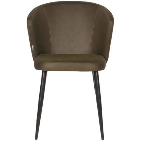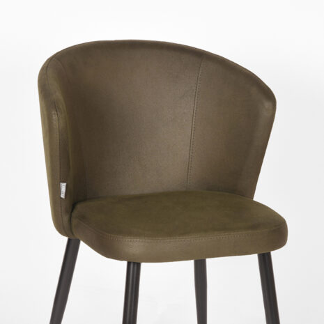 Wave, uitgevoerd in army kleurige microvezel heeft een vierkant gevormde zitting met elegante rondingen waardoor er een prettig zitoppervlak ontstaat. De strakke maar zeer elegante rugleuning heeft een ergonomisch design en een trendy uitstraling door de gave golvende vorm. De zwarte naar buiten staande poten zorgen ervoor dat de stoel lekker stabiel op de grond staat.