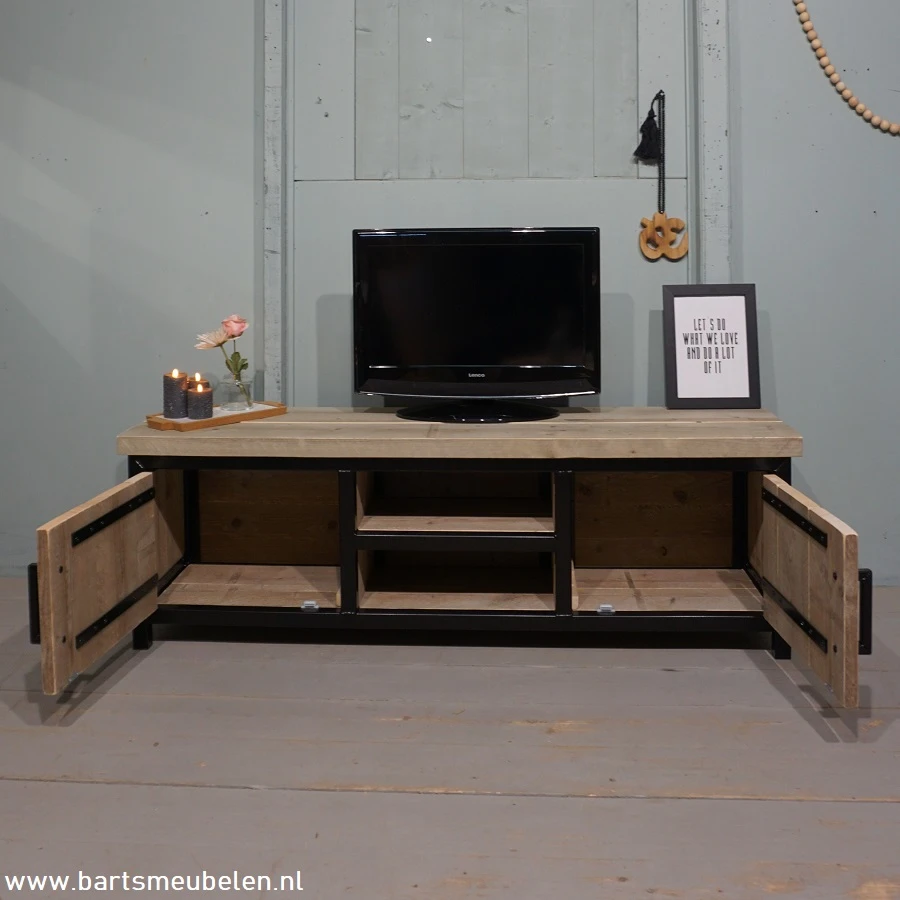 Dit model tv meubel wordt standaard gemaakt met planken en balken van old-look steigerhout.
