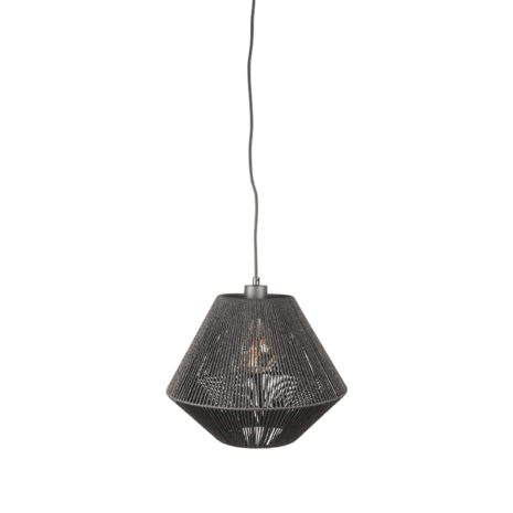Hanglamp Ibiza 1-lichts bestaat uit een diamantvormige kap, voorzien van zwart geweven jute. Door de geweven draad ontstaat er een halfopen lijnenspel waardoor er een prachtig lichteffect met schaduwwerking ontstaat als de lichtbron brandt. De diamantvormige kap hangt middels een zwartkleurig strijkijzerkoord vast aan de ronde zwarte metalen plafondplaat.