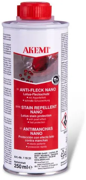 Akemi Anti Vlek Nano is een krachtig impregneermiddel die werkt met nanotechnologie. Het product brengt een onzichtbaar laagje aan op natuursteen, waardoor water, olie en vet er makkelijk vanaf glijden, dit wordt ook wel het lotus-effect genoemd.