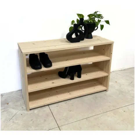 Met drie brede vakken biedt dit schoenenrek ruimte aan meerdere paren schoenen. Door het open ontwerp zie je in รฉรฉn oogopslag waar alles staat. Het stevige bovenblad maakt het meubel extra veelzijdig: ideaal voor het opbergen van laarzen of het neerleggen van een tas.