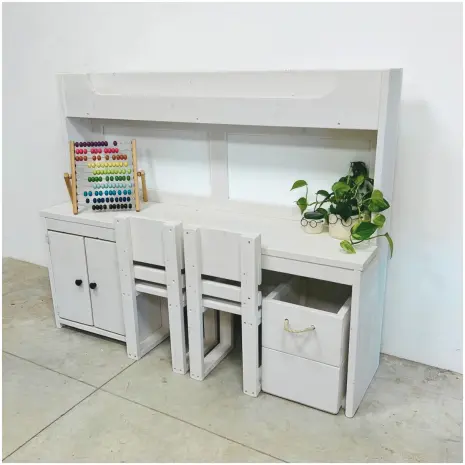 Deze speelmeubel van steigerhout past perfect in een kinderkamer, speelhoek of woonkamer. Door de neutrale witte afwerking laat het meubel zich eenvoudig combineren met verschillende woonstijlen. De stoeltjes en het kistje maken het geheel compleet, zodat kinderen meteen aan de slag kunnen.