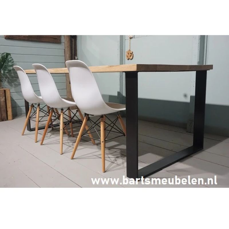 Eiken eettafel (40) met stalen strip U-onderstel stelt u hieronder naar eigen wens samen.