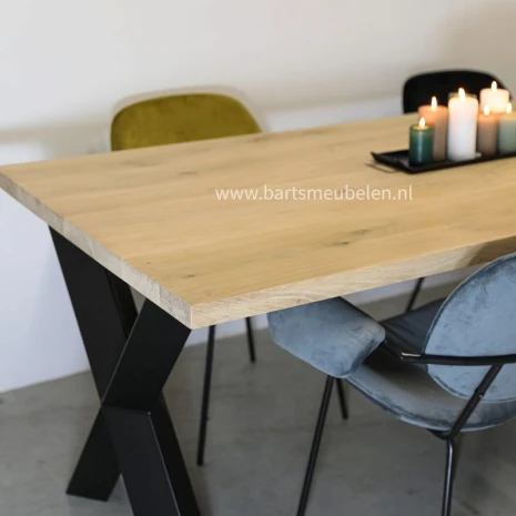 Wij hebben een ruim assortiment industriële eettafels. Waaronder industriële tafel Xavi. Deze eettafel industrieel heeft een prachtig massief eikenhouten blad van maar liefst 40 mm dik en een stalen X-poot onderstel diamant.