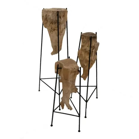 Plantentafel set Teak en staal. Drie hoogtes, natuurlijke uitstraling en geschikt voor planten of decoratie. Uniek door het massieve Teakblad.
