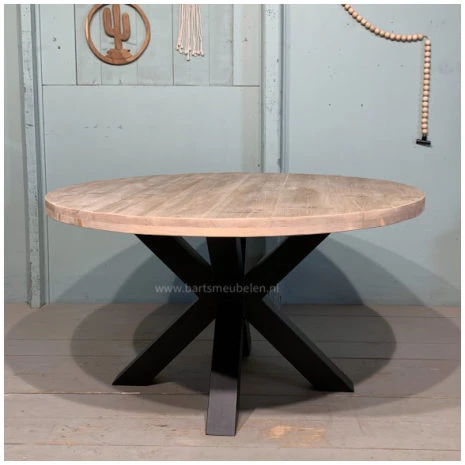 Onze ronde tafel Zef is een prachtige ronde eettafel met een dik steigerhouten blad en een stalen onderstel.