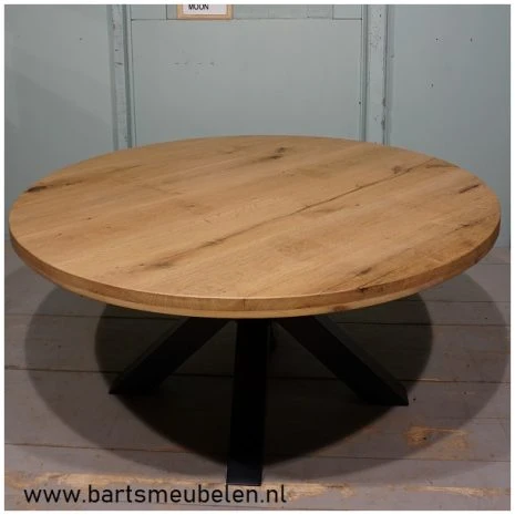 Het blad van deze ronde tafel Mira is gemaakt van onze vintage eikenhouten planken van +/- 35 mm dik en is opgedikt tot +/- 70 mm dik. Door de combinatie met het stalen matrix onderstel krijgt de tafel een stoere uitstraling.