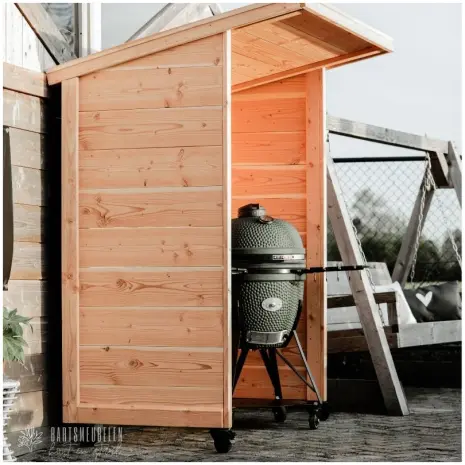 Ook buitenkeuken overkapping douglas afdak nummer 2 staat op stoere zwarte zwenkwielen, 2x geremd en 2x ongeremd. Dit afdak wordt geleverd als praktisch en makkelijk te monteren bouwpakket waardoor hij gemakkelijk de tuin in past.