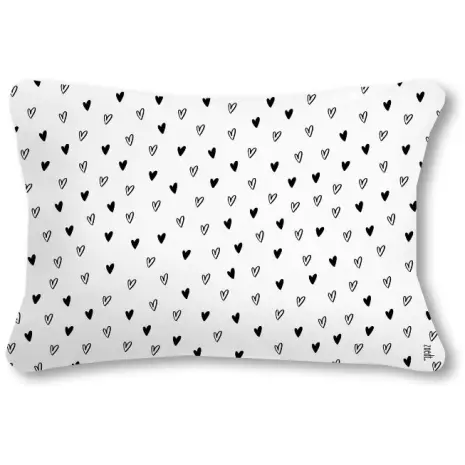 De achterkant van het kussen heeft een vrolijk hartjespatroon in zwart-wit. Gemaakt van waterafstotend polyester en voorzien van een rits.