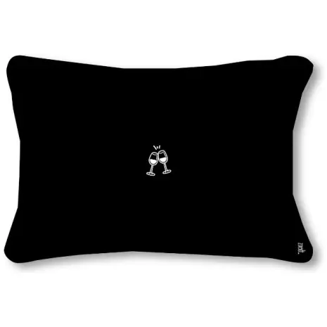 Langwerpig zwart buitenkussen van 50×30 cm met witte tekst aan de voorkant en twee proostende wijnglazen op de achterkant. Gemaakt van waterafstotend polyester.