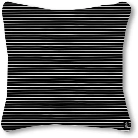 Zwart sierkussen van 40×40 cm met witte opdruk aan de voorkant en strepen op de achterzijde. Waterafstotend polyester met rits. Geschikt voor buitengebruik.