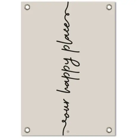 Tuinposter van 59×84 cm in beige met de tekst “Our Happy Place” in zwart. Gemaakt van weerbestendig PVC-doek en eenvoudig op te hangen.