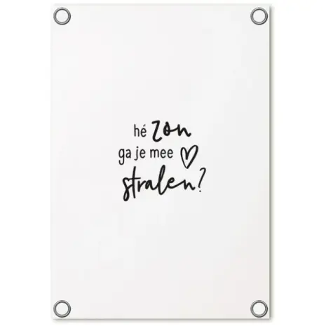 Geef jouw buitenruimte een opkikker met deze lichte en luchtige tuinposter van Zoedt. De speelse tekst “hé zon, ga je mee stralen?” is gedrukt in zwart op een rustige witte achtergrond perfect voor een frisse en zonnige uitstraling. Dankzij het stevige PVC-doek en de metalen ringen hang je deze poster eenvoudig op in je tuin, veranda of op het balkon.