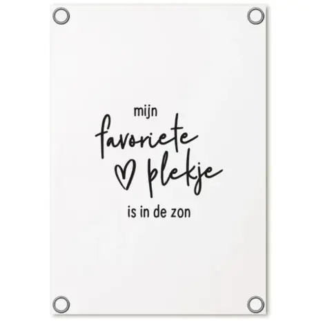 Deze witte tuinposter van Zoedt brengt een rustige en zonnige sfeer in je tuin, balkon of veranda. De vrolijke tekst “mijn favoriete plekje is in de zon” en het hartje zijn gedrukt in zwarte letters en vallen mooi op tegen de lichte achtergrond. Dankzij de waterafstotende stof en ringen in de hoeken is hij direct klaar om opgehangen te worden.