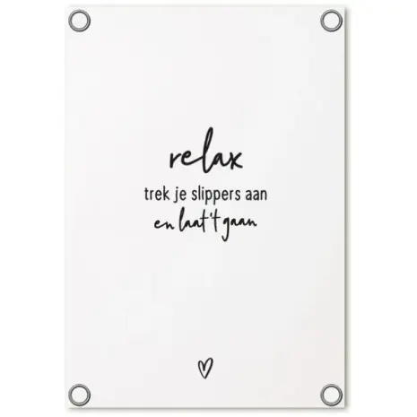 Deze witte tuinposter van Zoedt is de perfecte aanvulling voor een lichte, rustige buitenruimte. De ontspannen tekst “relax, trek je slippers aan en laat het gaan” in zwart steekt mooi af tegen de witte achtergrond. Onder de tekst staat een klein hartje dat het ontwerp subtiel afmaakt. Dankzij de stevige zeildoek kwaliteit en ringen in de hoeken is de poster eenvoudig op te hangen.
