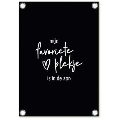 Deze tuinposter van Zoedt is gemaakt van stevig, waterafstotend PVC-doek en geschikt voor elk seizoen. De tekst “mijn favoriete plekje is in de zon” in speels wit lettertype met hartje maakt ‘m perfect voor jouw loungehoek of balkon. De metalen ringen in de hoeken maken het ophangen eenvoudig.