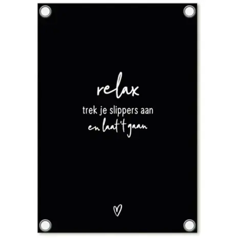 Met deze zwarte tuinposter van Zoedt geef je je tuin een ontspannen sfeer. De witte tekst “relax, trek je slippers aan en laat het gaan” is speels vormgegeven en onderaan staat een klein hartje. Dankzij het stevige PVC-zeildoek en de metalen ringen hang je deze poster eenvoudig op aan een schutting, muur of pergola.