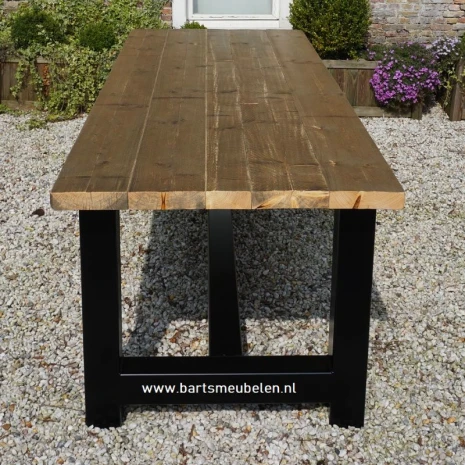 Deze tuintafel is stoer, stevig en robuust. Het tafelblad wordt gemaakt van onze prachtige 5 cm dikke steigerplanken en staat op een stoer stalen frame vervaardigd uit metalen koker 10×10 cm. Een stevige en bovendien prachtige tafel voor in uw tuin.