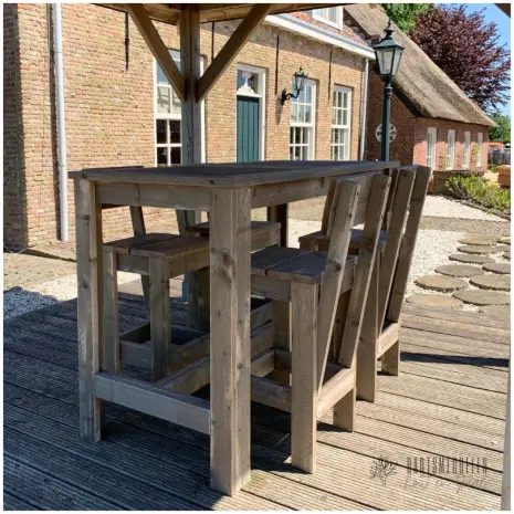 - Of deze tuinset met 6 barkrukken van steigerhout