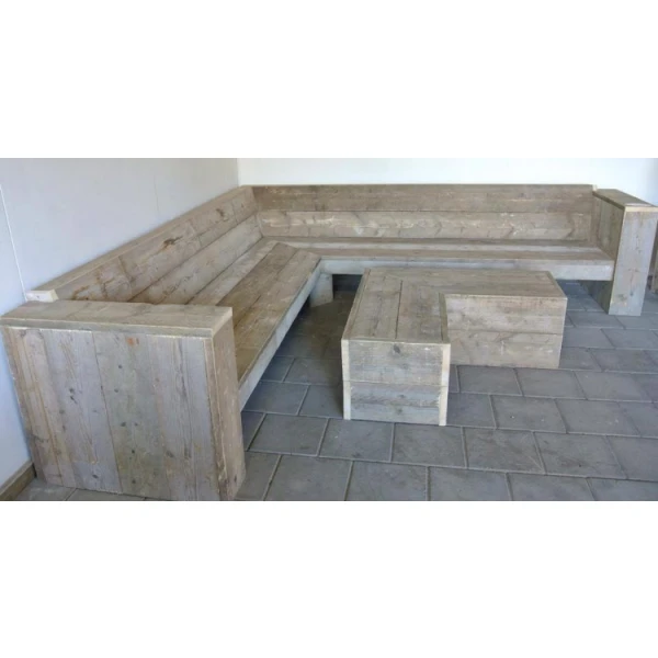 Verder is deze hoekbank gemaakt van nieuw steigerhout en heeft deze een grey-was kleurbehandeling gehad.