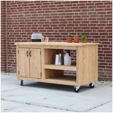 Door de handige wielen verrijd de deze douglas houten lage tuinkast overal naartoe. Handig als oppottafel, maar ook voor naast de barbecue!
