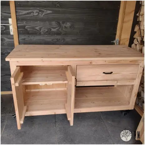 Met deze douglas werktafel ben je van alle gemakken voorzien. Er is opbergruimte, werkruimte en flexibiliteit door de praktische zwenkwielen. Deze douglas kast is ideaal voor het plaatsen onder de overkapping. Zet hem bijvoorbeeld naast de barbecue of gebruik hem voor het opbergen van alle accessoires rondom de tuin.