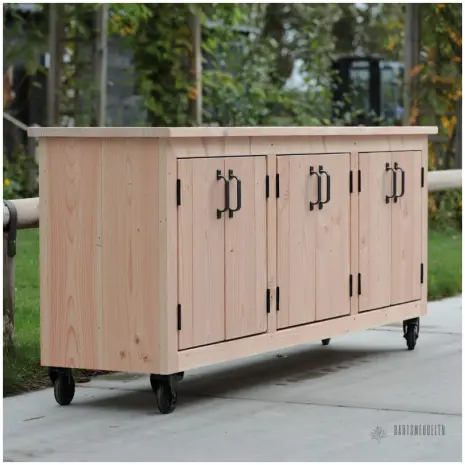 tuinkast op wielen met deuren op zwarte wielen van douglashout