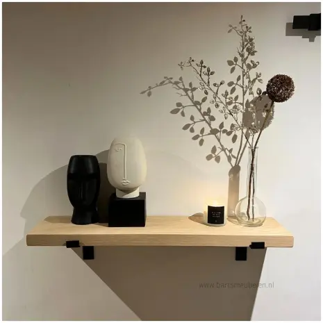 Ben je op zoek naar een stoere, maar luxe wandplank combinatie? Wat dacht je van deze massief eikenhouten wandplank van 4cm dik met zwarte plankdragers. Deze zijn makkelijk zelf te monteren en zijn praktisch voor vele ruimtes. Bovendien stel je deze naar je eigen gewenste afmeting samen.