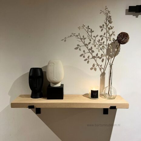 Eikenhouten wandplank 4cm dik + dragende plankdragers zwart metaal <170